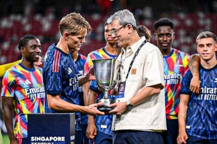 阿森纳季前赛赛后颁奖环节,厄德高不举杯&把奖杯放地上号召合影